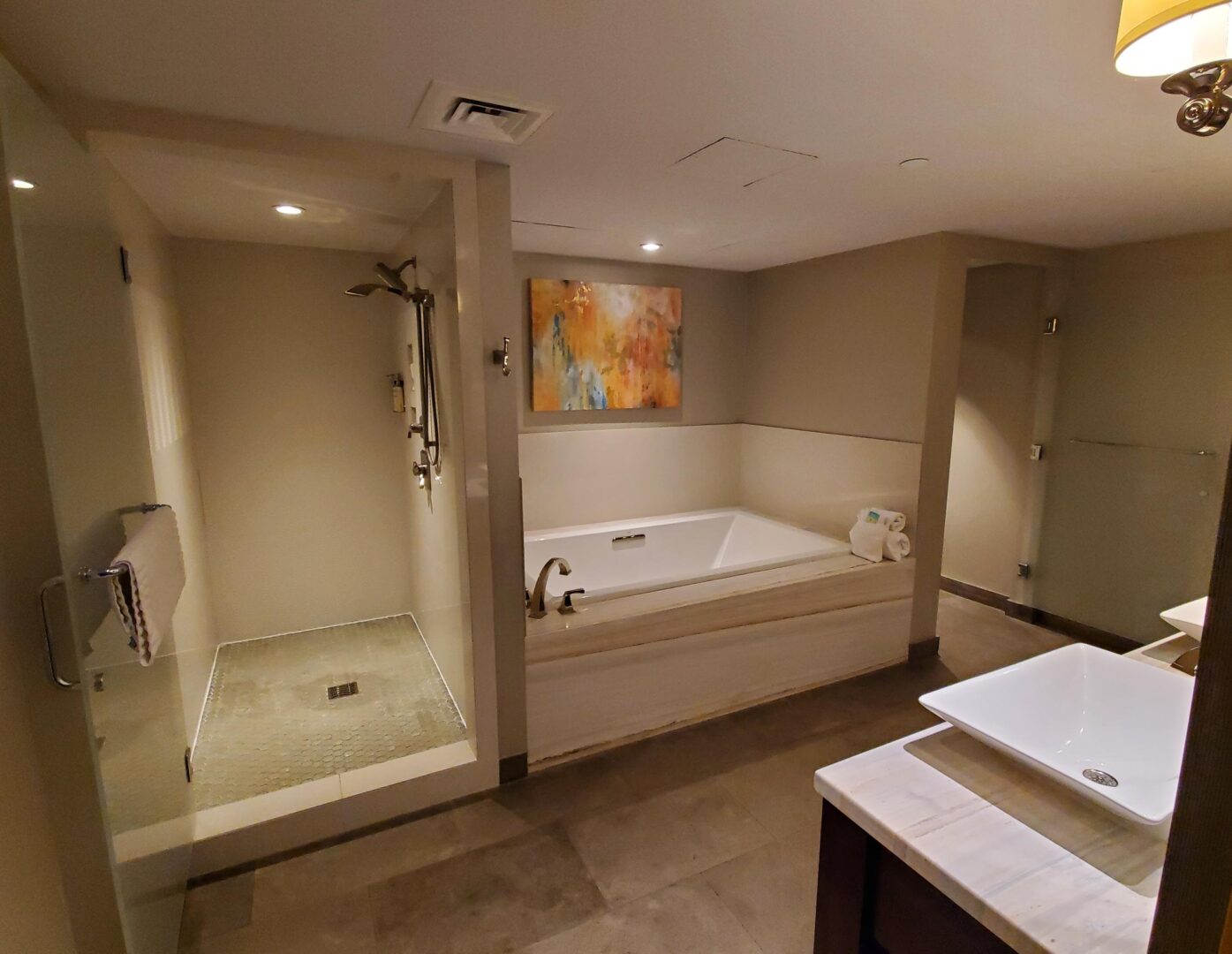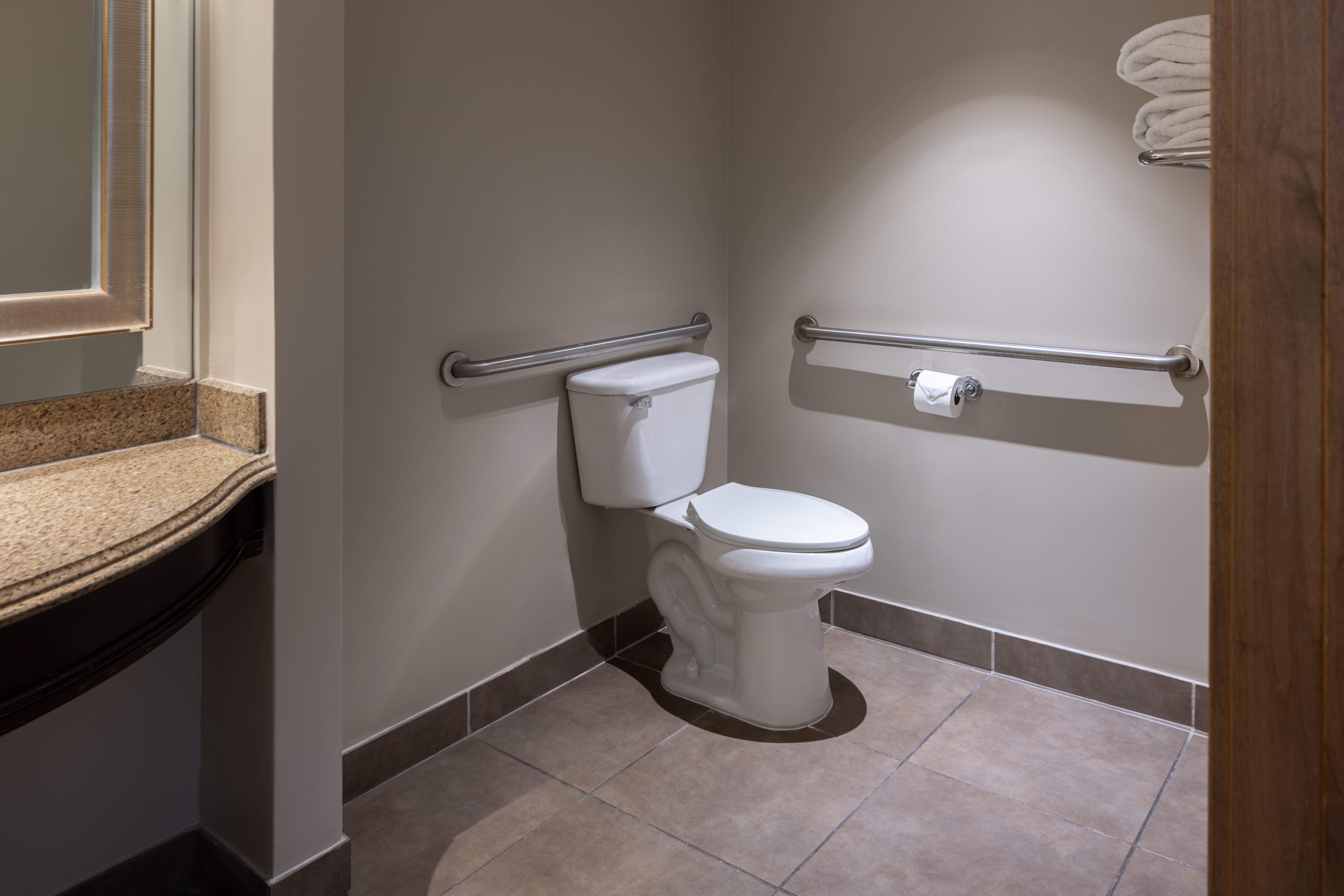 This one-bedroom accessible suite features bathroom grab bars, sight and hearing-impaired features, a shower bench, a low tub and a handheld showerhead, an in-room safe, a refrigerator, wireless internet, and a TV in the bedroom with premium channels.