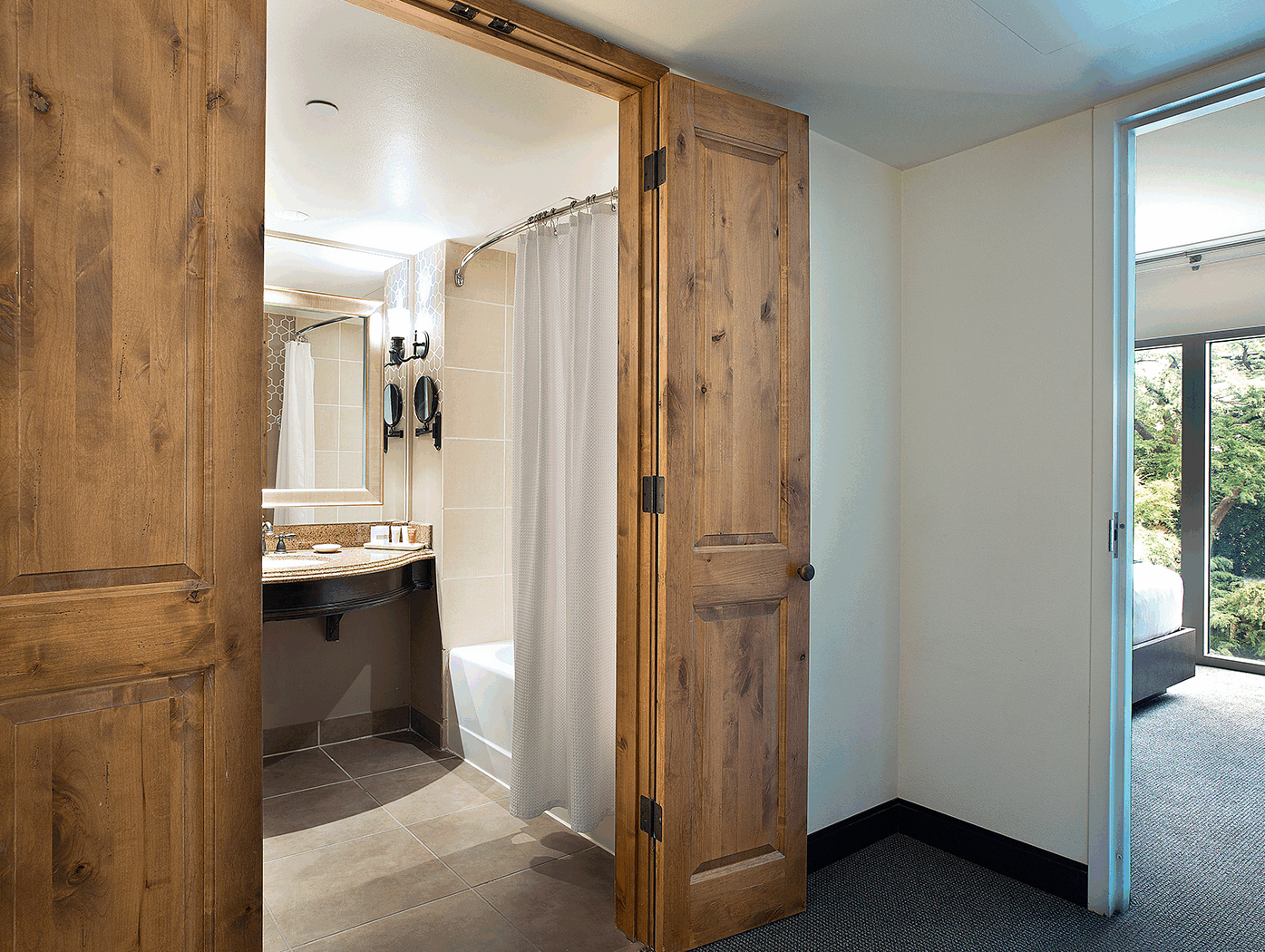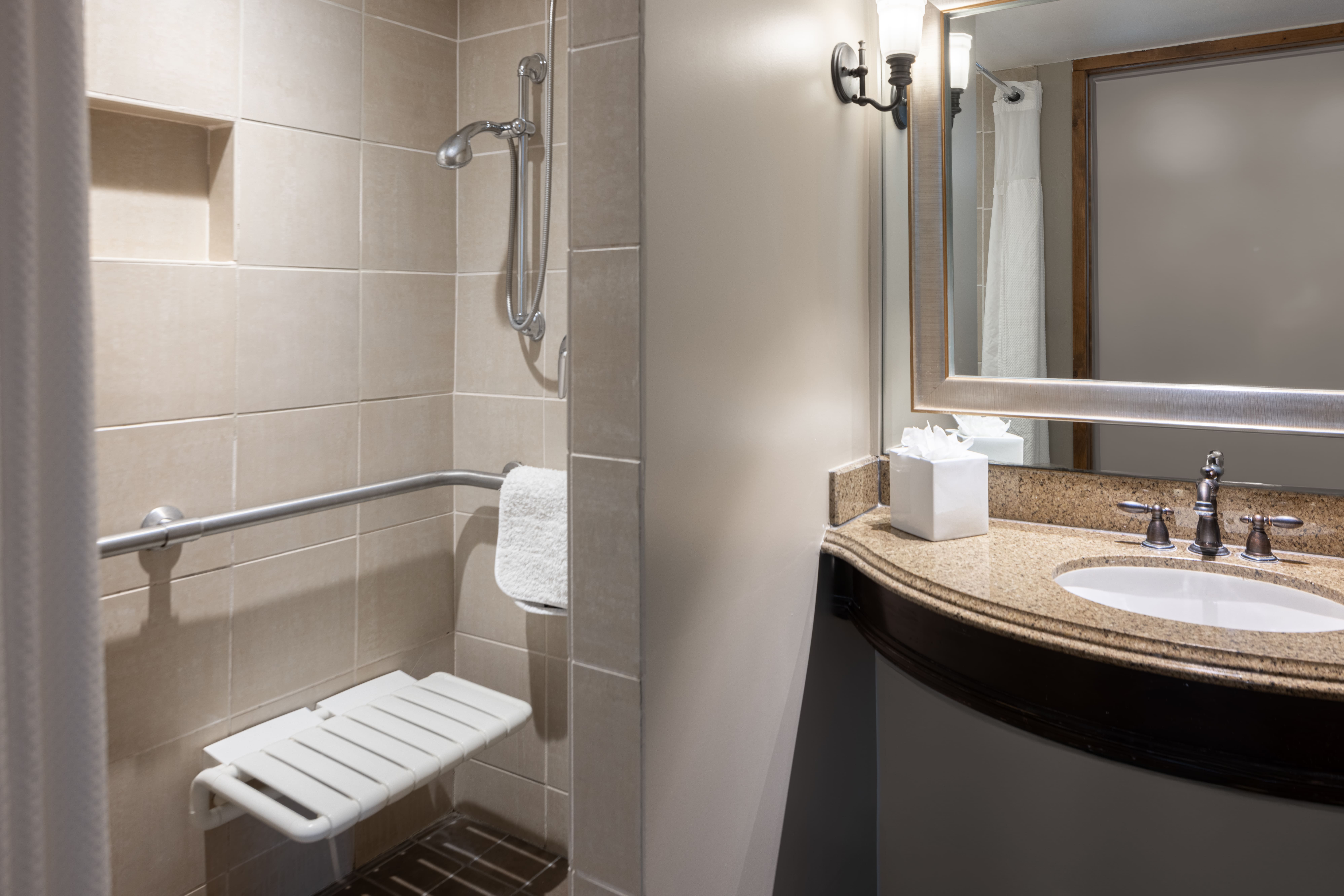 This one-bedroom accessible suite features bathroom grab bars, sight and hearing-impaired features, a shower bench, either a low tub and a handheld showerhead or a roll-in shower, an in-room safe, a refrigerator, wireless internet, and a TV in the bedroom with premium channels.